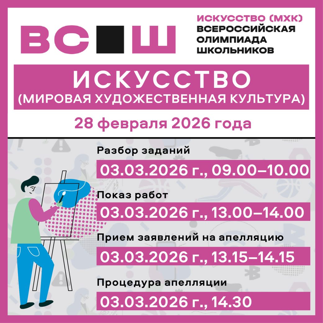 28 февраля в Центре профмастерства педагогов Вологодского института развития образования пройдет региональный этап всероссийской олимпиады школьников по искусству (МХК). 3 марта состоятся процедуры разбора заданий, показ работ и рассмотрение апелляций. Программа олимпиады по МХК опубликована на сайте: olymp.viro35.ru/?p=10738