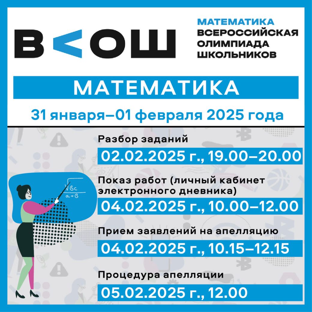 31 января и 1 февраля в Центре профмастерства ВИРО пройдет региональный этап всероссийской олимпиады школьников по математике (ул. Набережная 6-й Армии,199а). Олимпиада по математике имени Леонарда Эйлера для школьников 7-8 классов пройдет на площадке Центра выявления, поддержки и развития талантов и способностей у детей и молодежи Вологодской области «Импульс» (г. Вологда, ул. Горького, д. 101).2 февраля пройдет разбор заданий, 4 февраля — показ работ и прием заявлений на апелляцию, 5 февраля — процедура апелляции.